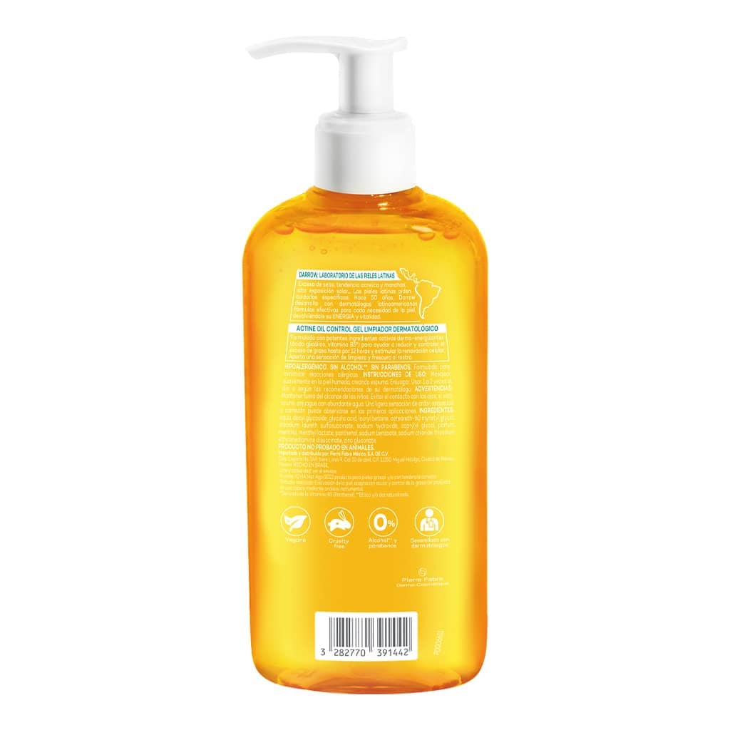 Actine es la gama dermatológica especialista de las pieles latinas muy grasas y con imperfecciones. Darrow Actine Oil Control Gel Limpiador promueve una piel matificada y libre de grasa hasta por 12 horas, tiene una acción renovadora y está libre de efectos rebote. Su fórmula eficaz aporta también hidratación al rostro. Comprueba los beneficios del NUEVO Darrow Actine Oil Control Gel Limpiador con Ácido glicólico y Vitamina B5. Limpieza y frescura inmediata en el rostro, aporta sensación de piel purificada.