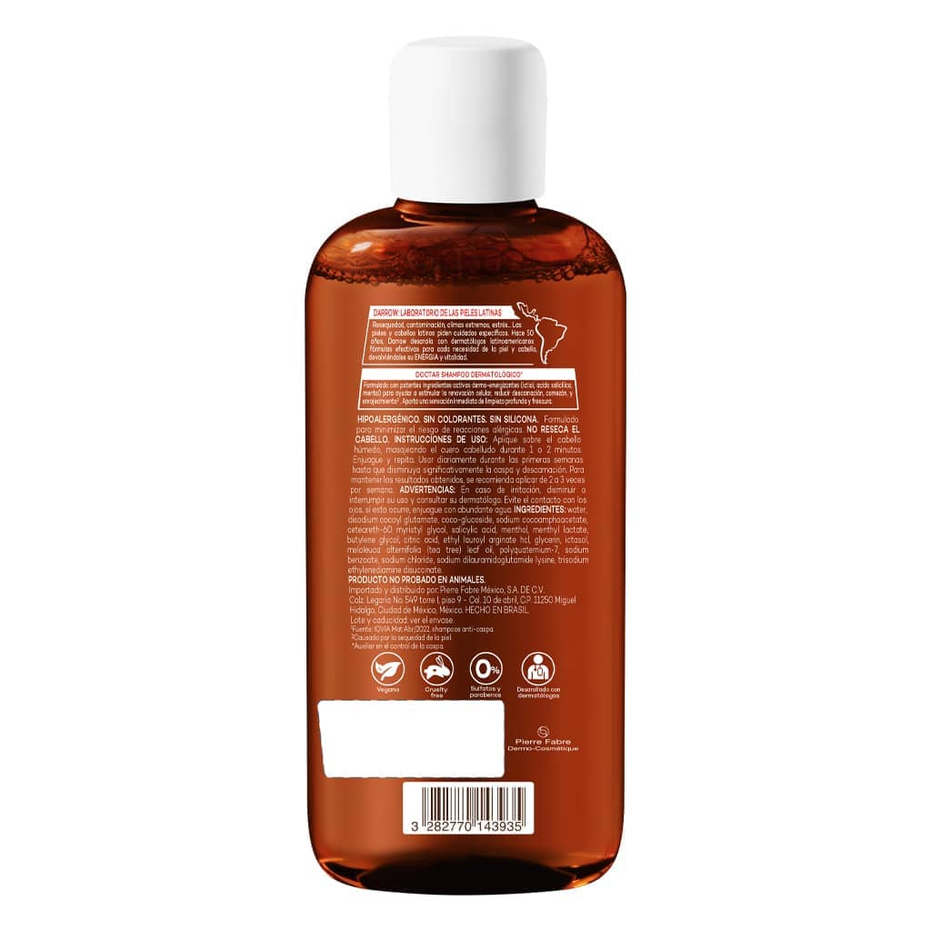 Doctar es una higiene anticaspa de prescripción dermatológica. Darrow Doctar shampoo anticaspa intensivo tiene una fórmula completa para combatir la descamación intensa, la comezón* y el enrojecimiento con resultados desde la primera aplicación. Comprueba los beneficios de Darrow Doctar shampoo con Ictiol, Ácido salicílico y Mentol. Limpieza profunda, protección a la fibra capilar y sensación de frescura al instante. *asociada a la capa